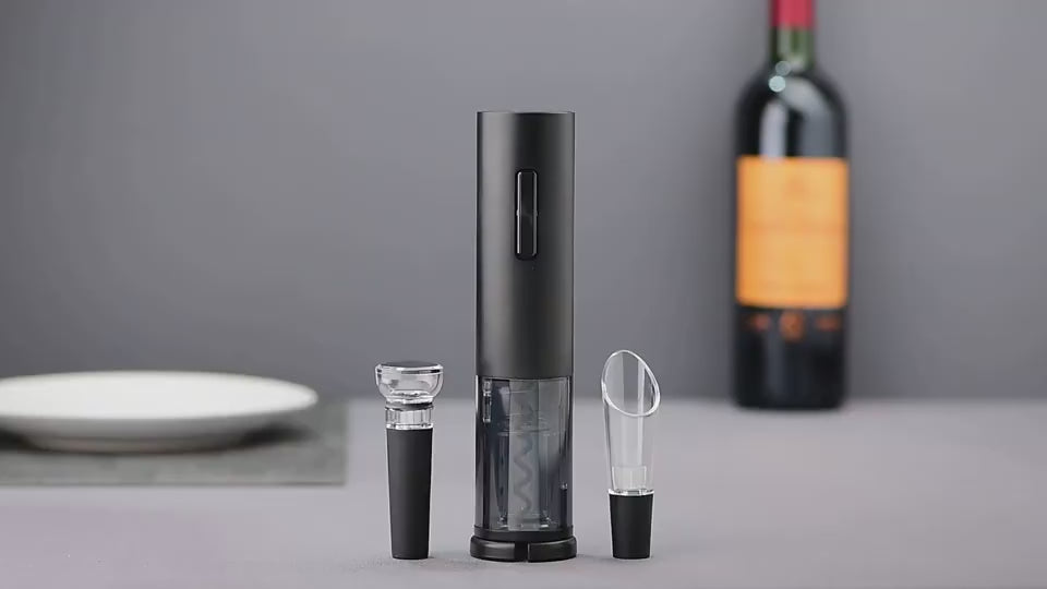 Σετ 4 τεμαχίων Wine Lover Collection: Συνδυασμός ηλεκτρικού ανοιχτήρι κρασιού, κόφτης αλουμινίου, συσκευή αδειάσματος κρασιού και πώμα κενού. Αυτό το σετ ηλεκτρικού ανοιχτήρι κρασιού είναι μια ενιαία λύση για το άνοιγμα, την έκχυση και τη συντήρηση του κρασιού. (Δεν περιλαμβάνει βάση φόρτισης και προσαρμογέα φόρτισης USB.